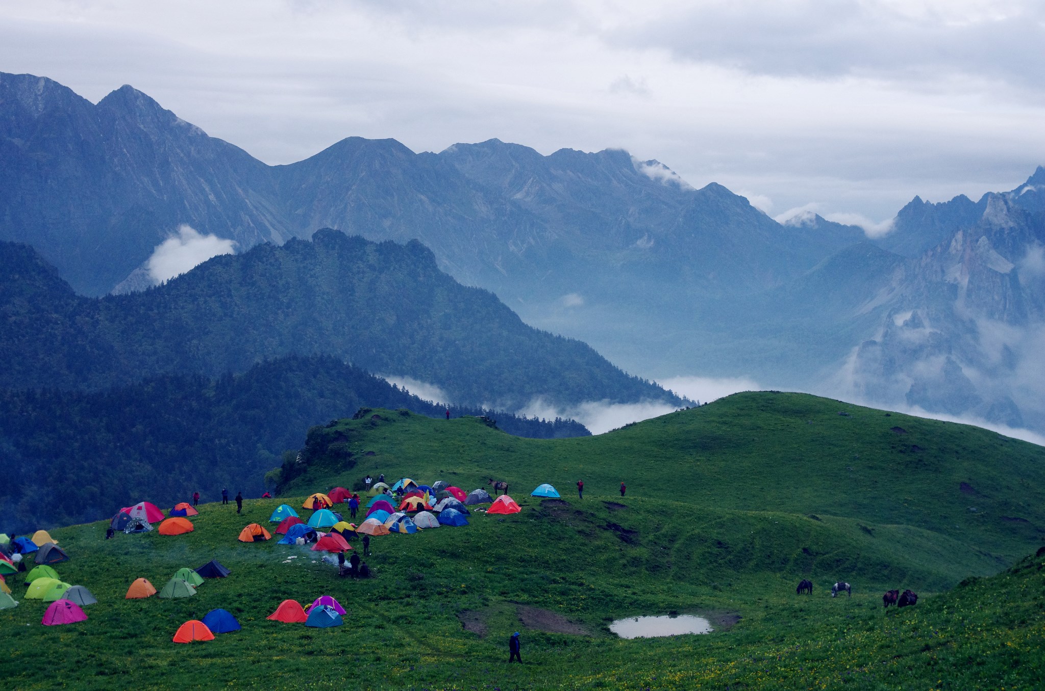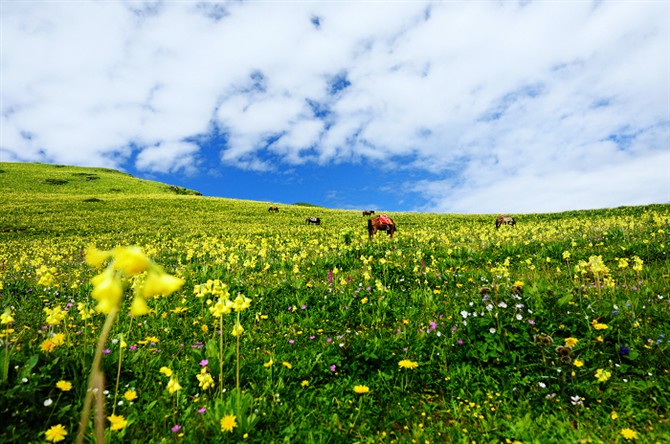 | 구정산은 정상등반과 트레킹이 모두 가능한 곳으로 산중에서 2 박을 해야 정상적인 트레킹이나 정상등반이 가능하다. 산중에는 백룡지(白龙池-3,300m), 흑룡지(黑龙池-3,900m), 수의해자(水依海子-3,927m) 등의 호수가 있어 대부분 이곳을 야영지로 이용을 한다. 산행의 기점인 안향진까지는 쓰찬성 성도에서 240km로 고속도로와 국도로 이동하는 시간을 모두 합쳐서 3시간30분~4시간이 소요된다. 사자왕봉 정상(獅子王峰-4,984m)이나 太子城顶(4791m)까지 계획을 한다면 총 이동거리가 47km로 일찍 이동할 수 있도록 계획을 세워야 한다. 그러나 구정산을 능선의의 야생화와 여기서 보이는 주변 봉우리의 모습이 가장 핵심적인 일정으로 궂이 피크등반을 고집하지 않아도 된다. 그렇다고 무리하게 일정을 줄인다면 구정산을 제대로 감상하기에는 부족함이 있으니 경험이 있는 전문가나 전문여행사를 찾는 것이 중요하다. 사천성의 오지에서 그렇듯이 이곳에도 말과 마방이 포터를 대신한다. 야영에 필요한 텐트나 취사장비, 그리고 트레커나 등반객들이 휴대하는 개인장비는 모두 말로 이동을 한다. 가끔씩 고소로 고생하시거나 체력적으로 부담이 있는 분들도 말을 이용하기도 한다. |
