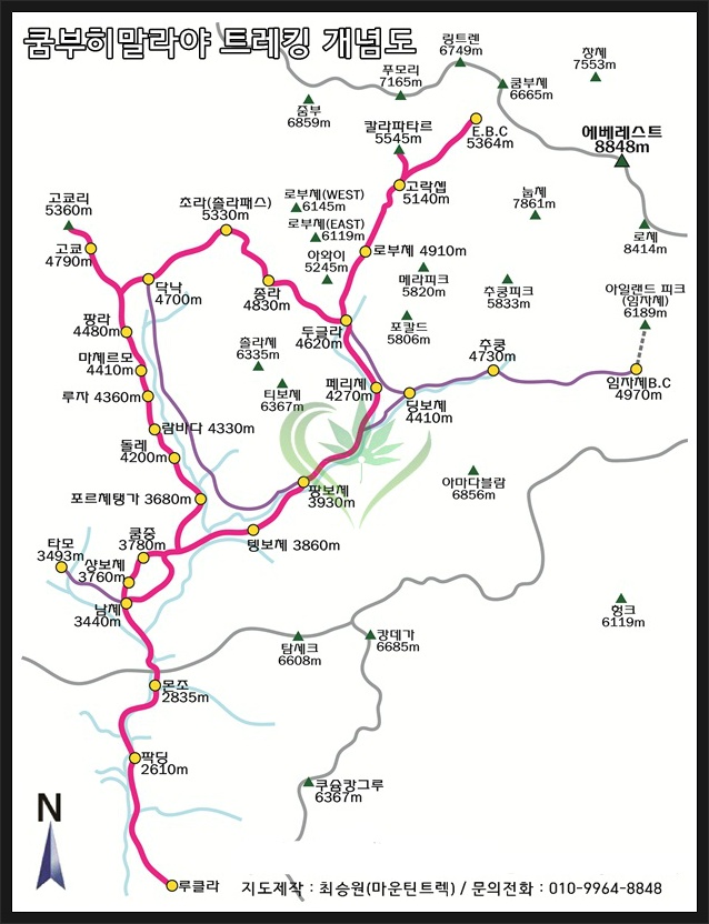 3400미터의 남체에 도달하기 때문에 고소적응에 신경 쓰지 않으면 트레킹에 실패한다. 카트만두와 루클라 간의 국내선은 날씨가 나쁠 경우 결항이 되므로 일정에 예비일을 짜두는 편이 좋다. 에베레스트를 전망할 수 있는 칼라파타(5545m)에 이르는 EBC 코스와 고쿄리(5340m)를 오르는 고쿄 코스기 제일 대중적인 코스며 타미와 추쿵으로 다녀오는 사이드 트레킹도 아주 좋다.