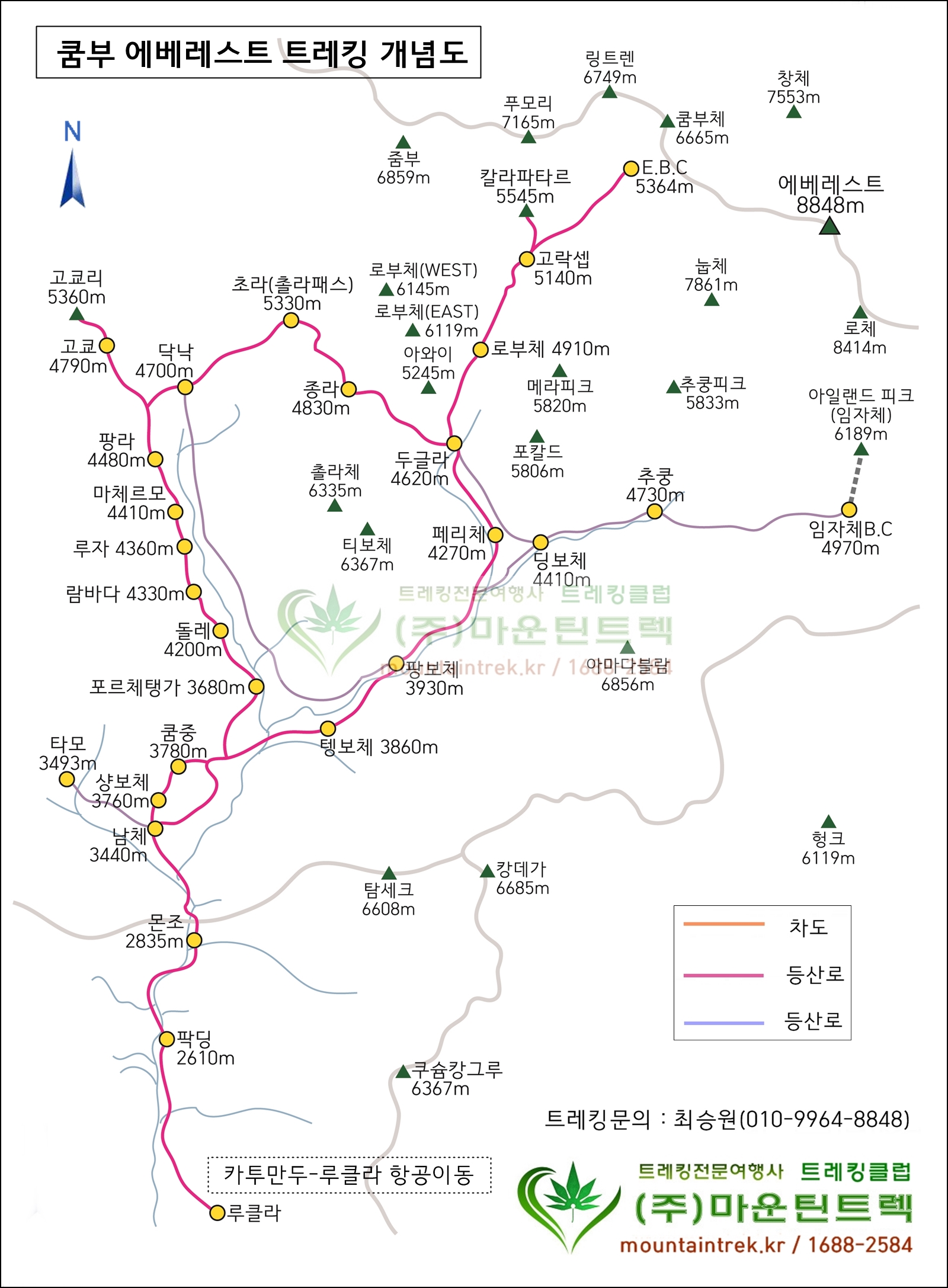 트레킹 시작 이틀만에 해발 3,400미터의 남체에 도달하기 때문에 고소적응에 신경 쓰지 않으면 트레킹에 실패한다. 카트만두와 루클라 간의 국내선은 날씨가 나쁠 경우 결항이 되므로 일정에 예비일을 짜두는 편이 좋다.