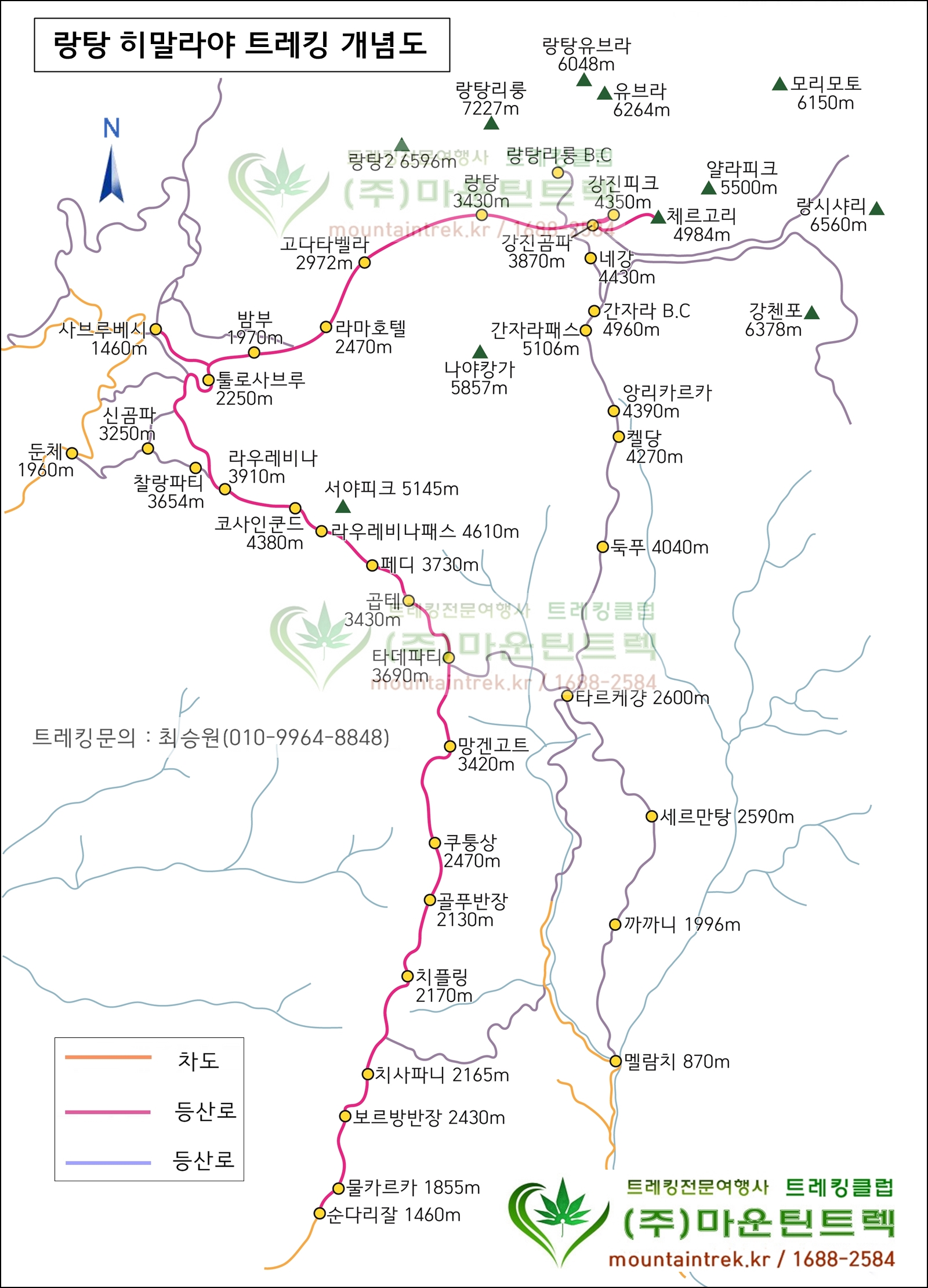 랑탕 트레킹은 안나푸르나, 에베레스트와 함께 네팔의 3대 트레킹 코스로 각광 받고 있다. 산군 남방에는 힌두교 성지 코사인쿤드의 고산호수가 있으며, 산군의 서쪽에는 7,000m 급 산들이 모여 있는 거네쉬 산군이 있다.